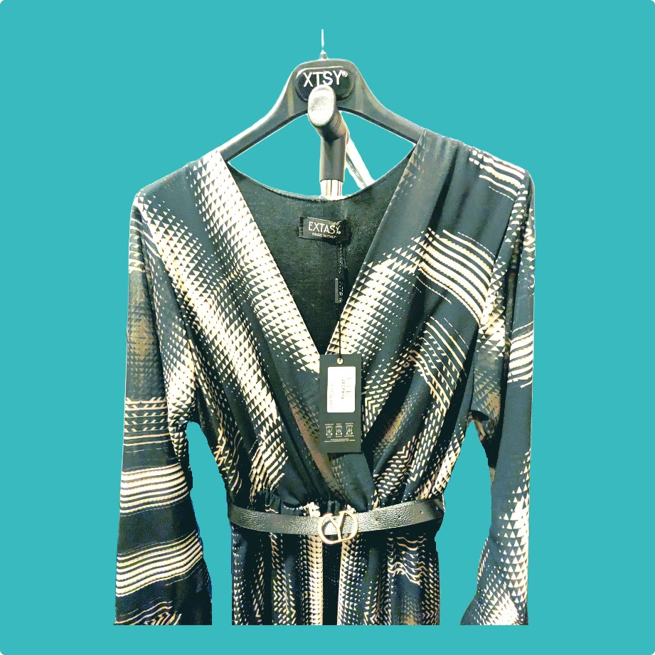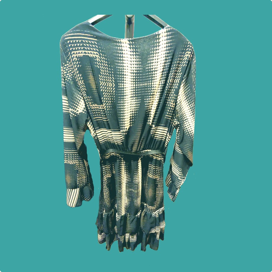 Jolie robe noir italienne fluide à manches longue , col V, longueur genou ,confectionne dans une matiere legere avec une jupe à volants. une ceinture à la taille souligne la silhouette et apporte une touche d’elegance et de feminite. Taille unique , nous racommandons la taille S/M.