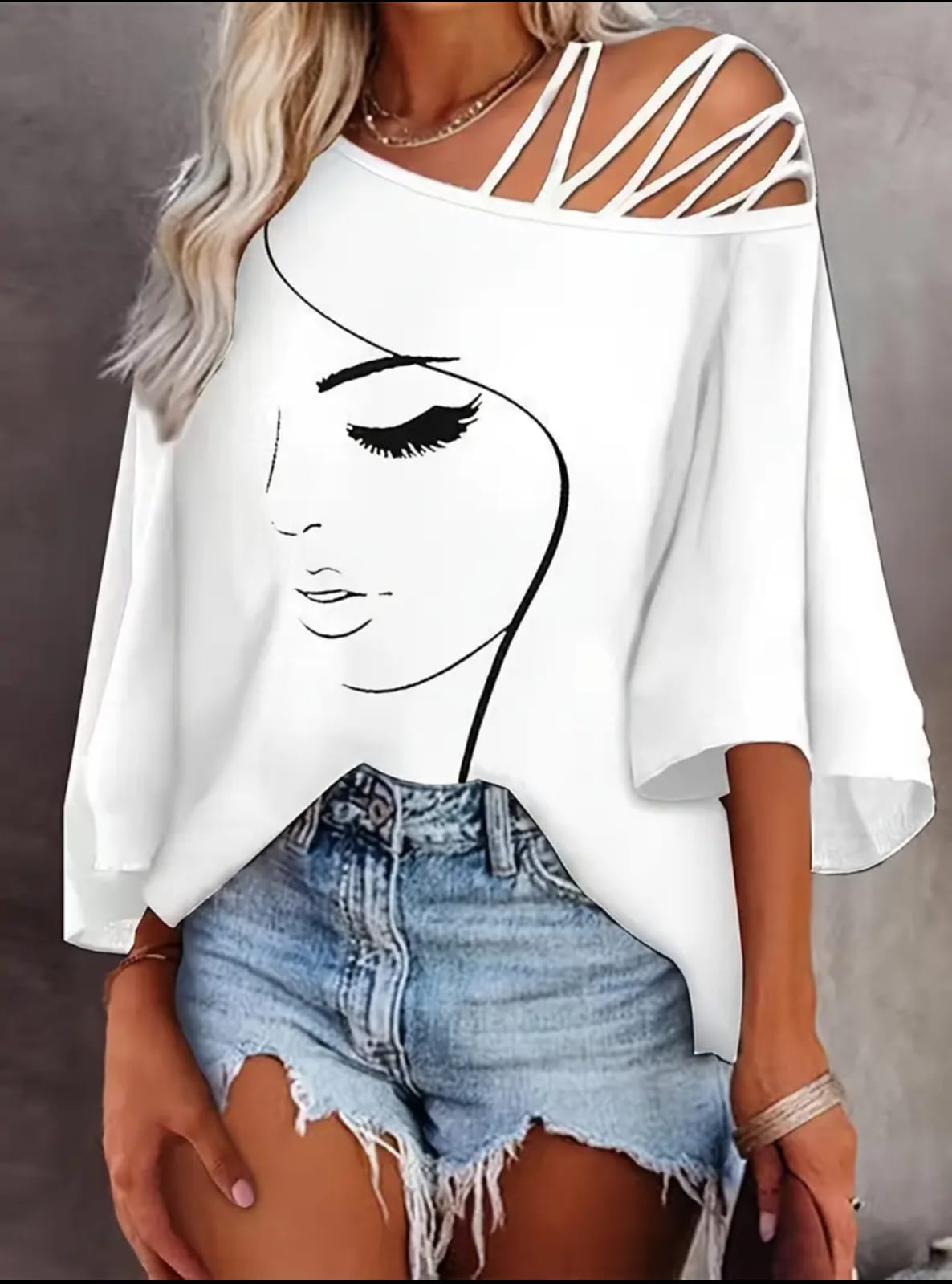 T-shirt femme tendance à épaules dénudées en polyester extensible. Design moderne avec détail bretelles croisées et imprimé ligne visage. Manches courtes, style décontracté parfait pour les vacances. Lavable en machine pour un entretien facile.